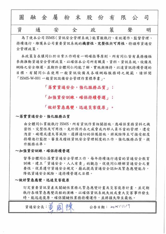 為了使本公司ISMS(資訊安全管理系統)能貫徹執行、有效運作、監督管理、持續進行,維護本公司重要資訊系統的機密性、完整性與可用性,特頒布資通安全管理政策。